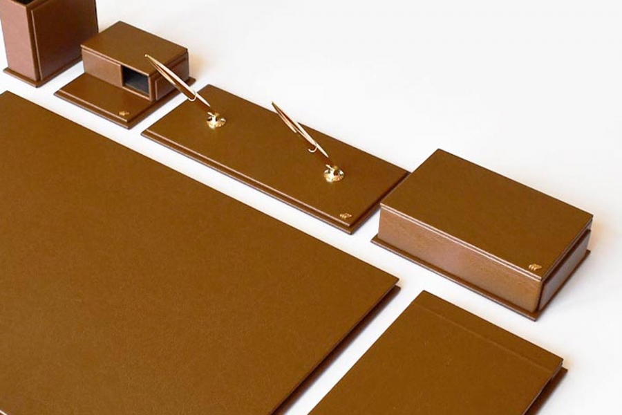 This deskset, especially made of artificial leather with leather look, is combined with different lines and completely hand workmanship. It has 40 different colors to choose from and 20 pieces to choose from.