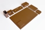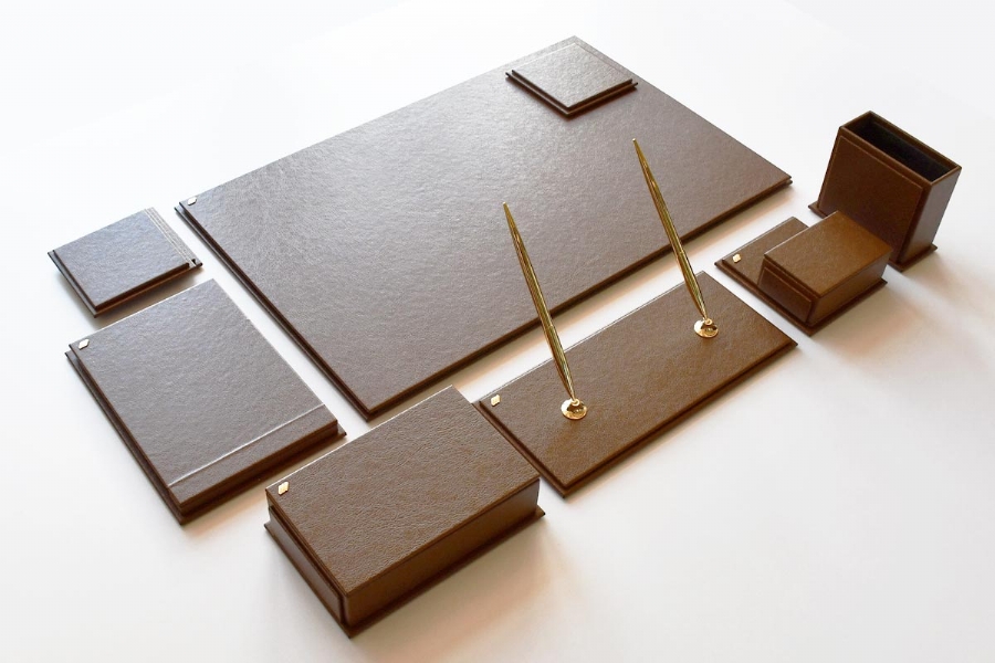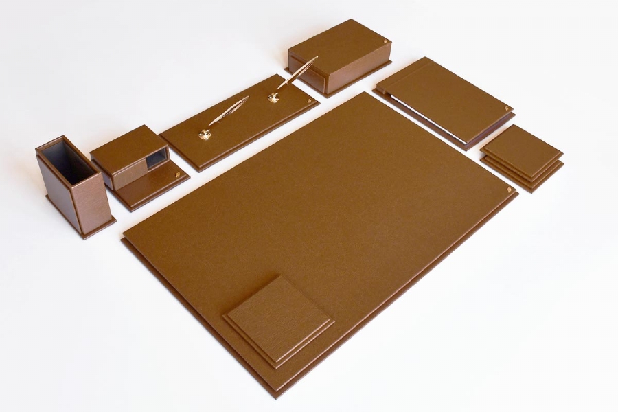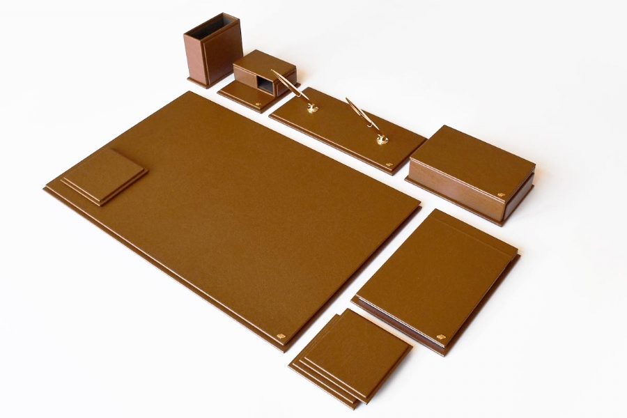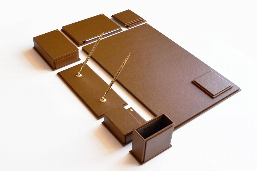 This deskset, especially made of artificial leather with leather look, is combined with different lines and completely hand workmanship. It has 40 different colors to choose from and 20 pieces to choose from.