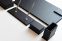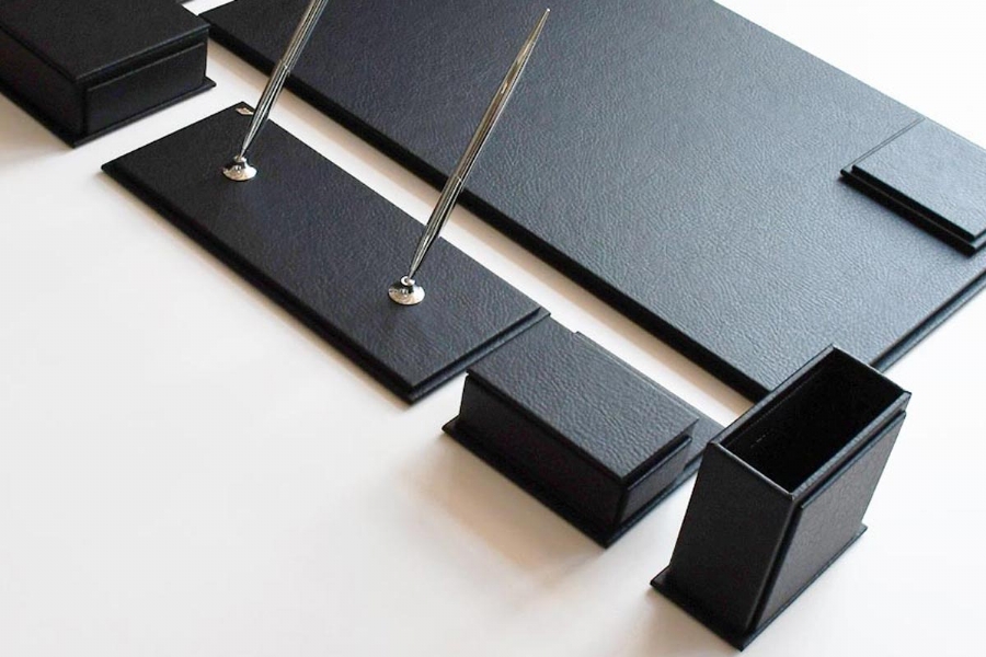 This deskset, especially made of artificial leather with leather look, is combined with different lines and completely hand workmanship. It has 40 different colors to choose from and 20 pieces to choose from.
