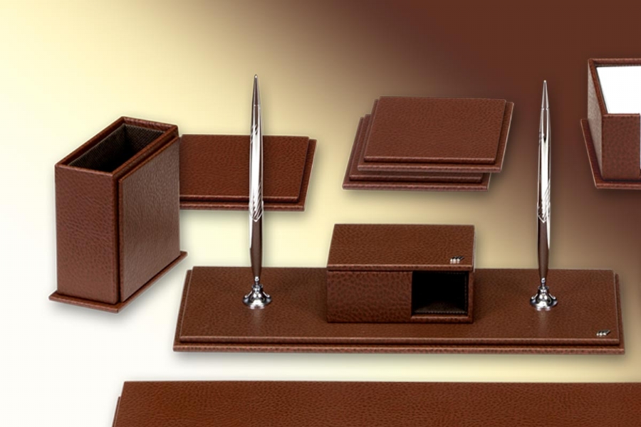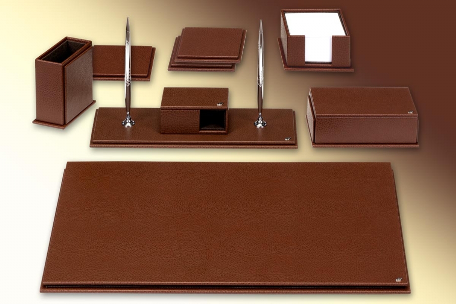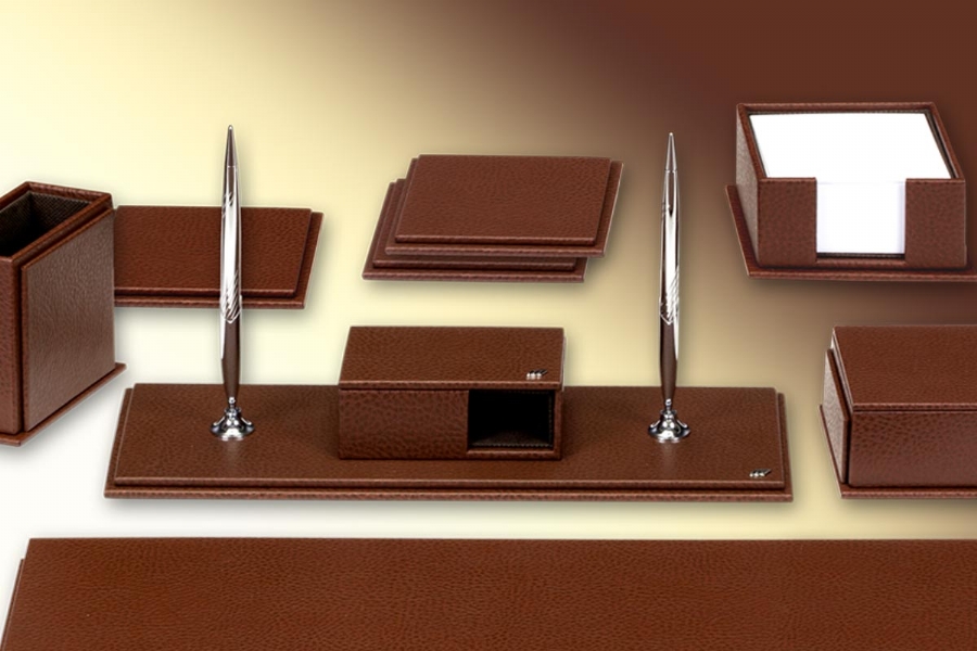 This deskset, especially made of artificial leather with leather look, is combined with different lines and completely hand workmanship. It has 40 different colors to choose from and 20 pieces to choose from.