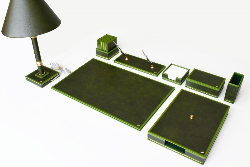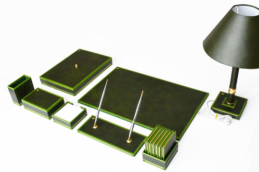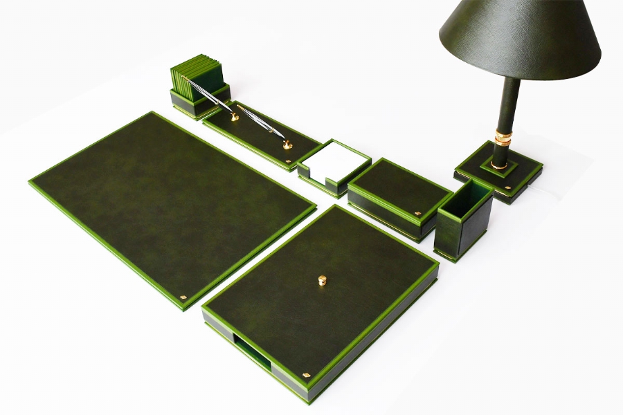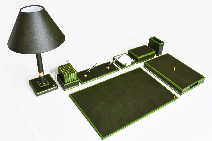 This desk set prepared with carefully selected Italian leather; perfect hand workmanship is integrated and enriched with the accessories used. Its pad is made of flexible material and provides a soft use. This luxury table set prepared for elite offices has 3 different leather colors.