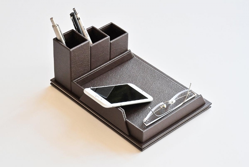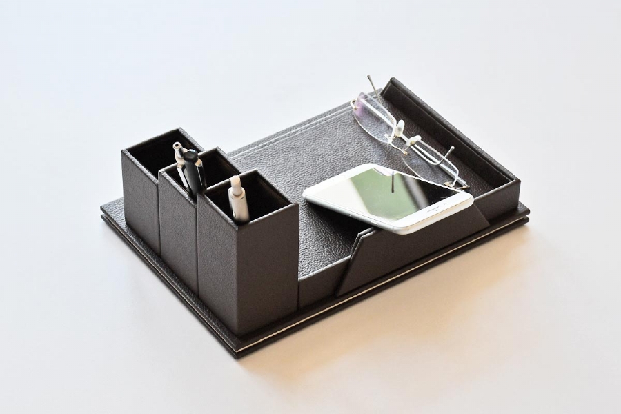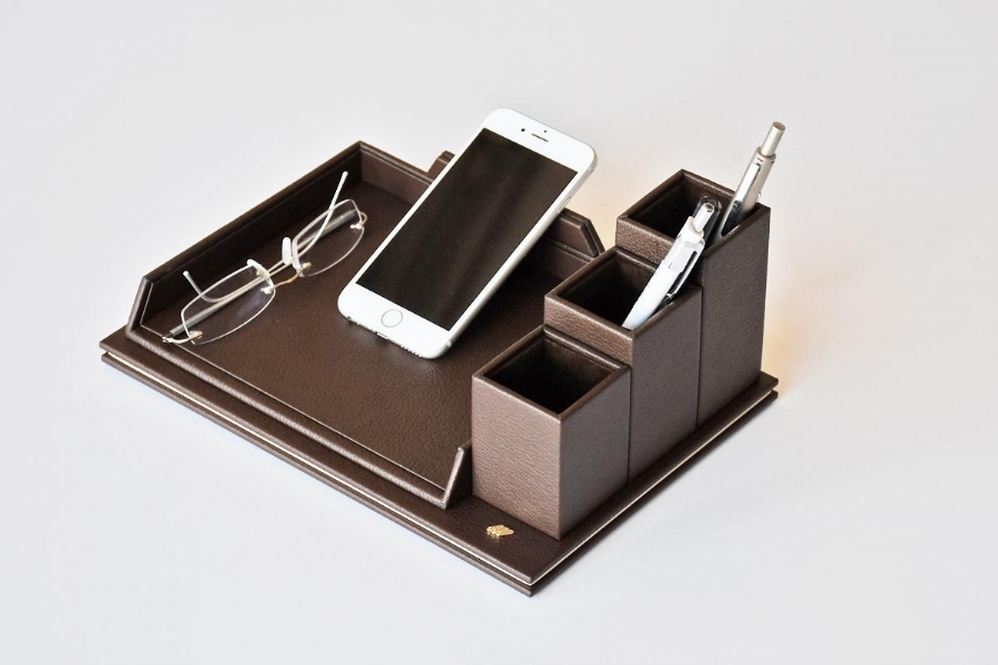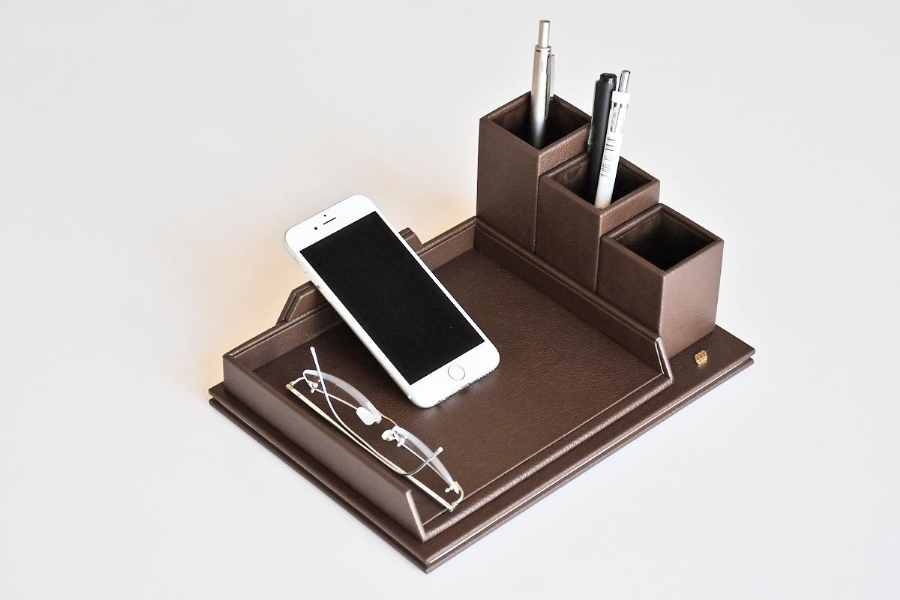 This table top set prepared with carefully selected Italian calf leather is a useful accessory for you to put your phone, glasses and to protect your pens. There are also 40 different leather colors to choose from.