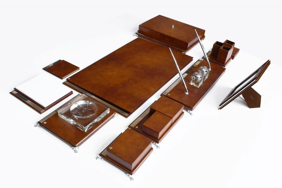 The elegant combination of Italian leather and Crom plated metal parts visually reflecting the distinctness, is a special set along with its crom plated metal parts and lines out of the ordinary rank.This meticulous handmade set is available at different colors.