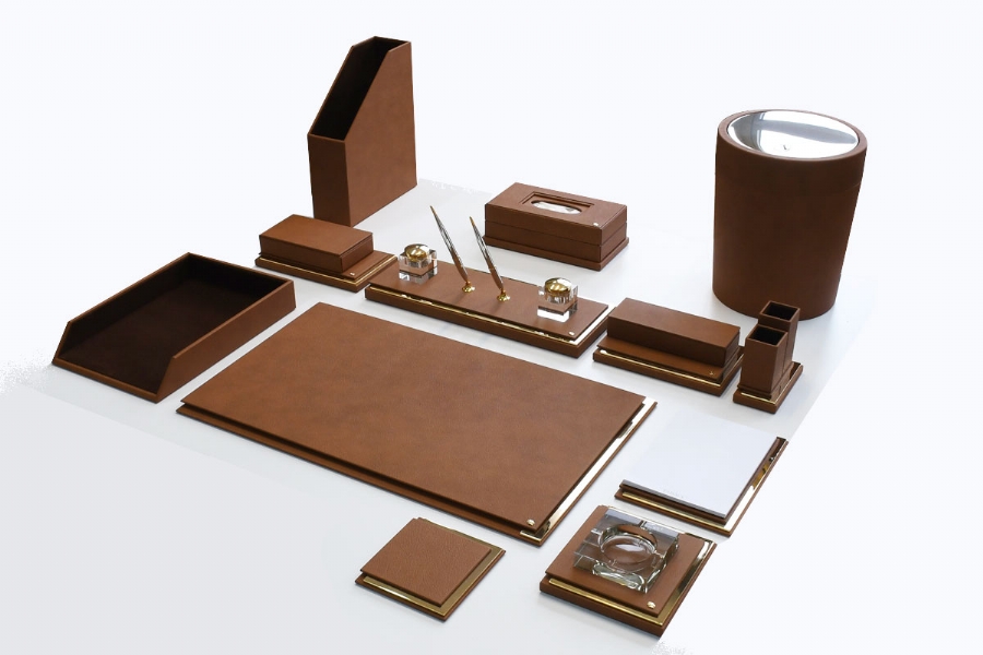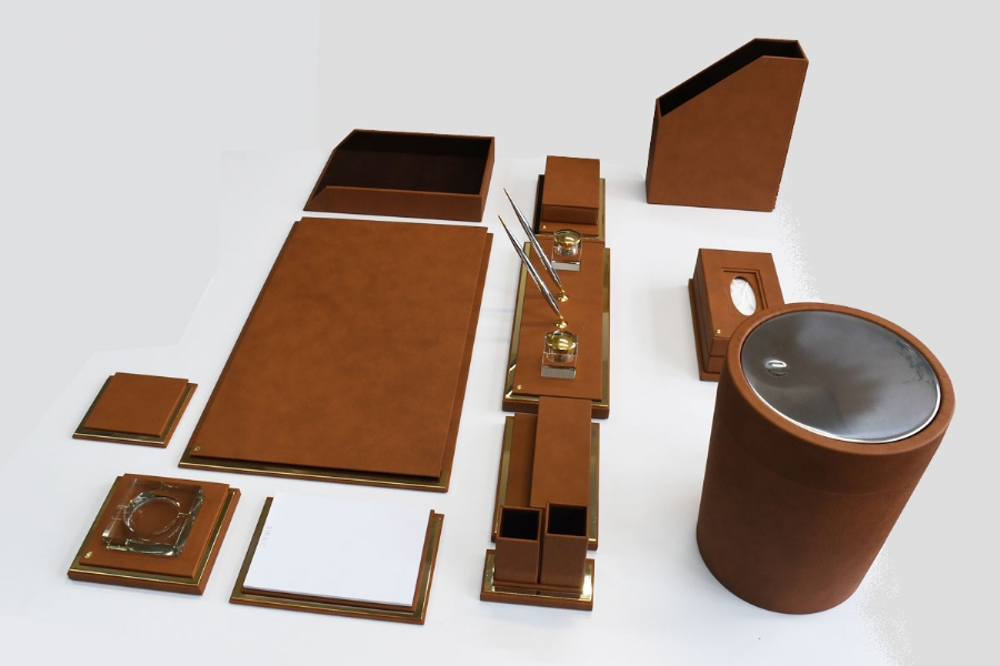 The elegant combination of Italian leather and gold plated metal parts visually reflecting the distinctness, is a special set along with its gold plated metal parts and lines out of the ordinary rank.This meticulous handmade set is available at fourty different colors.