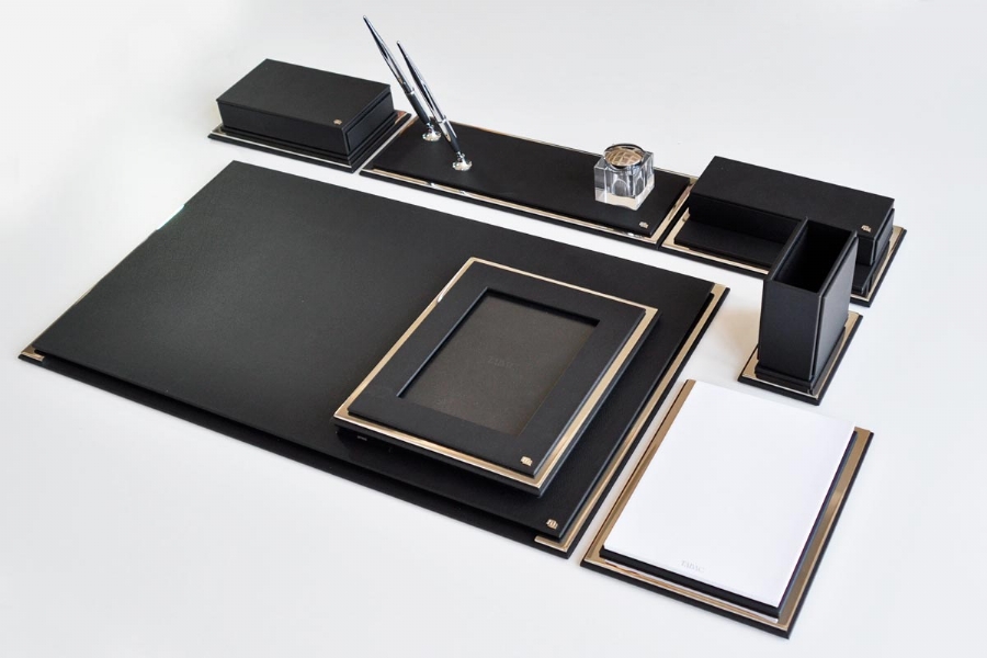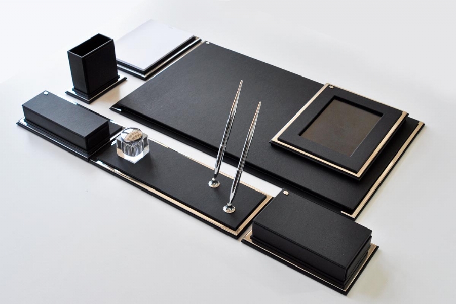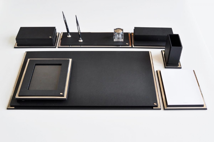 One of the best examples of classic Italian leather and gold plating, this desk set; It reflects elegance with its flawless handcraft and special leather. These luxury table sets, which are indispensable accessories of classical offices, have forty different color options.